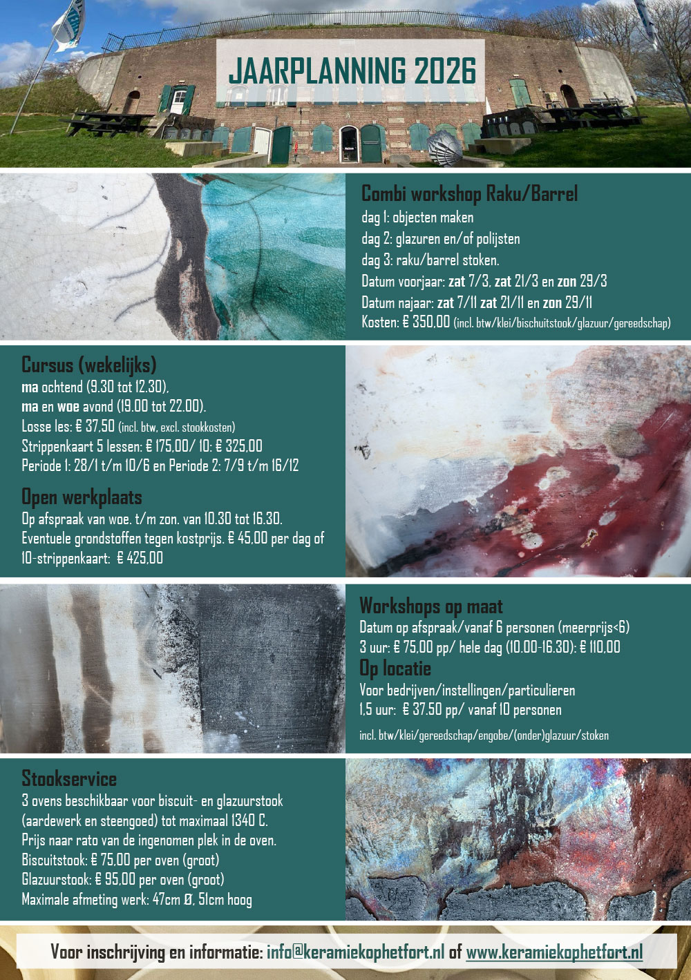 Prijs is incl. btw, klei, engobes, onder- en transparantglazuur, stoken; excl. lunch.