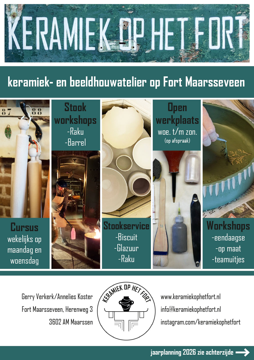 Het cursusgeld is inclusief btw, klei, gebruik materialen, machines, gereedschap, engobes, (onder)glazuur (zeer ruim aanbod), koffie en thee.